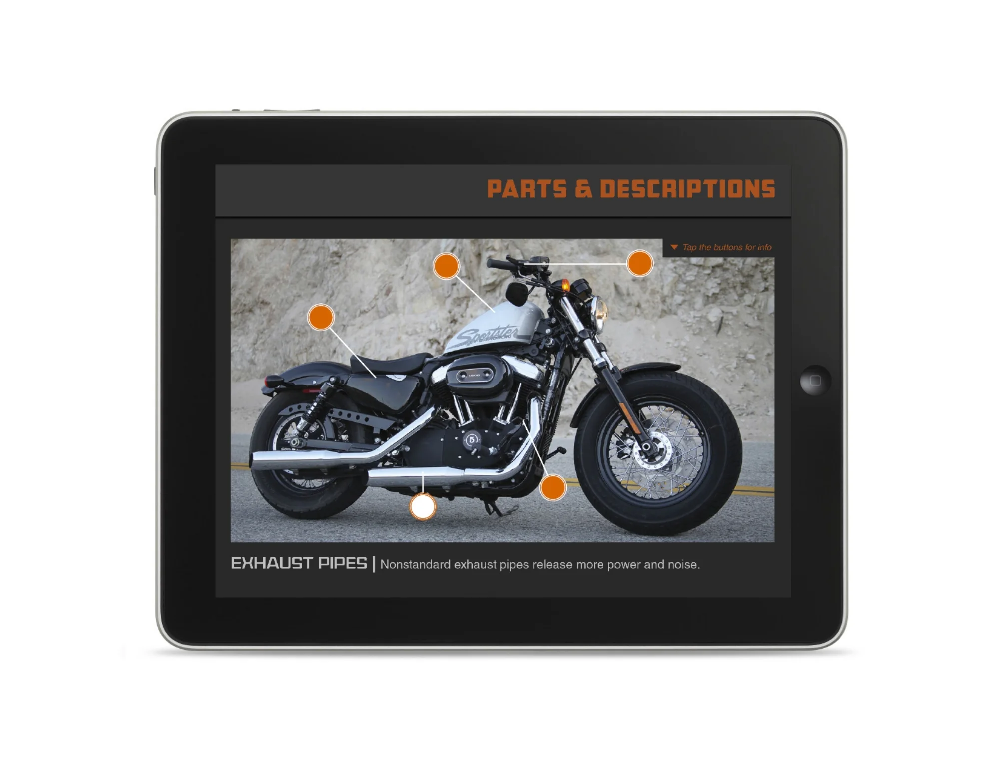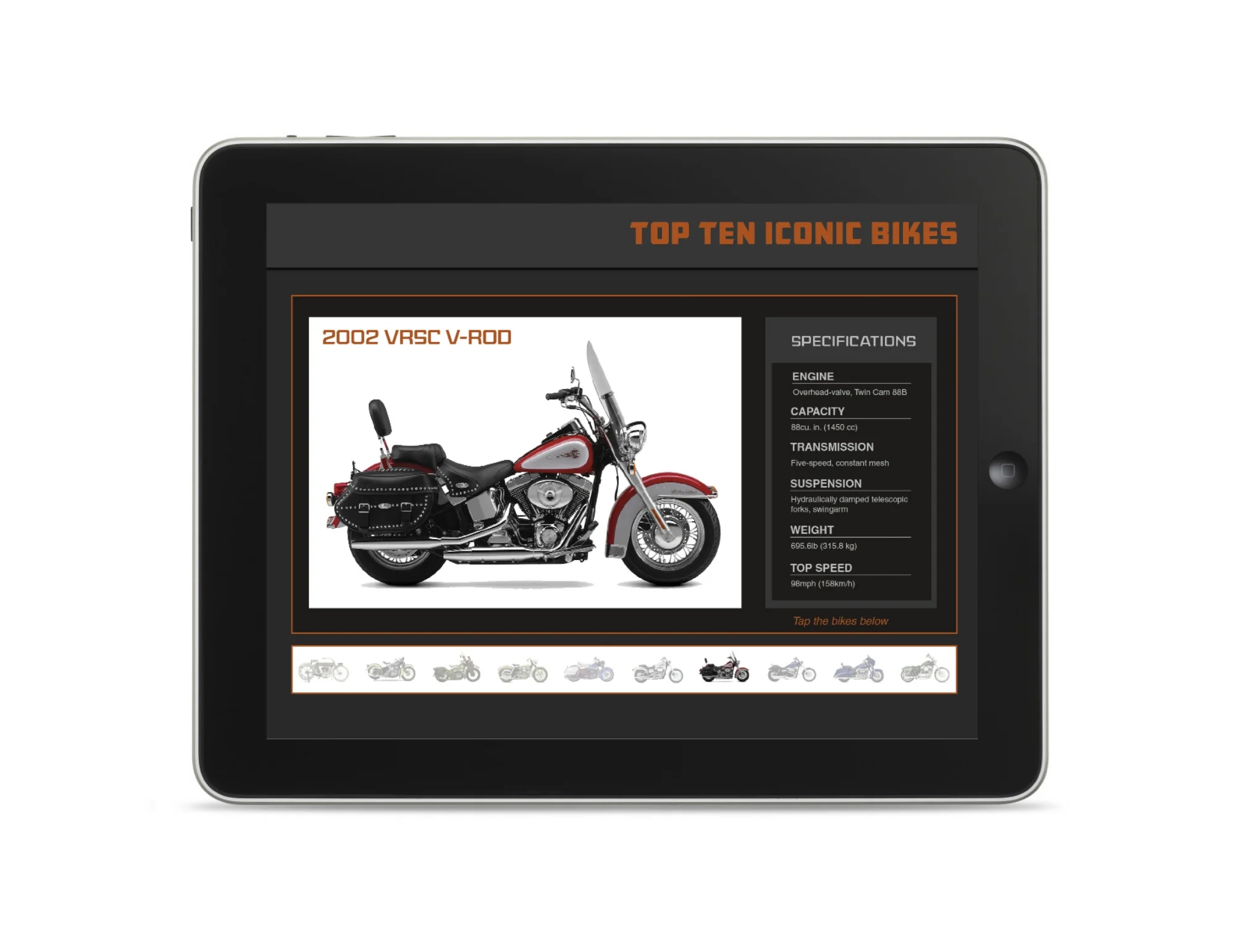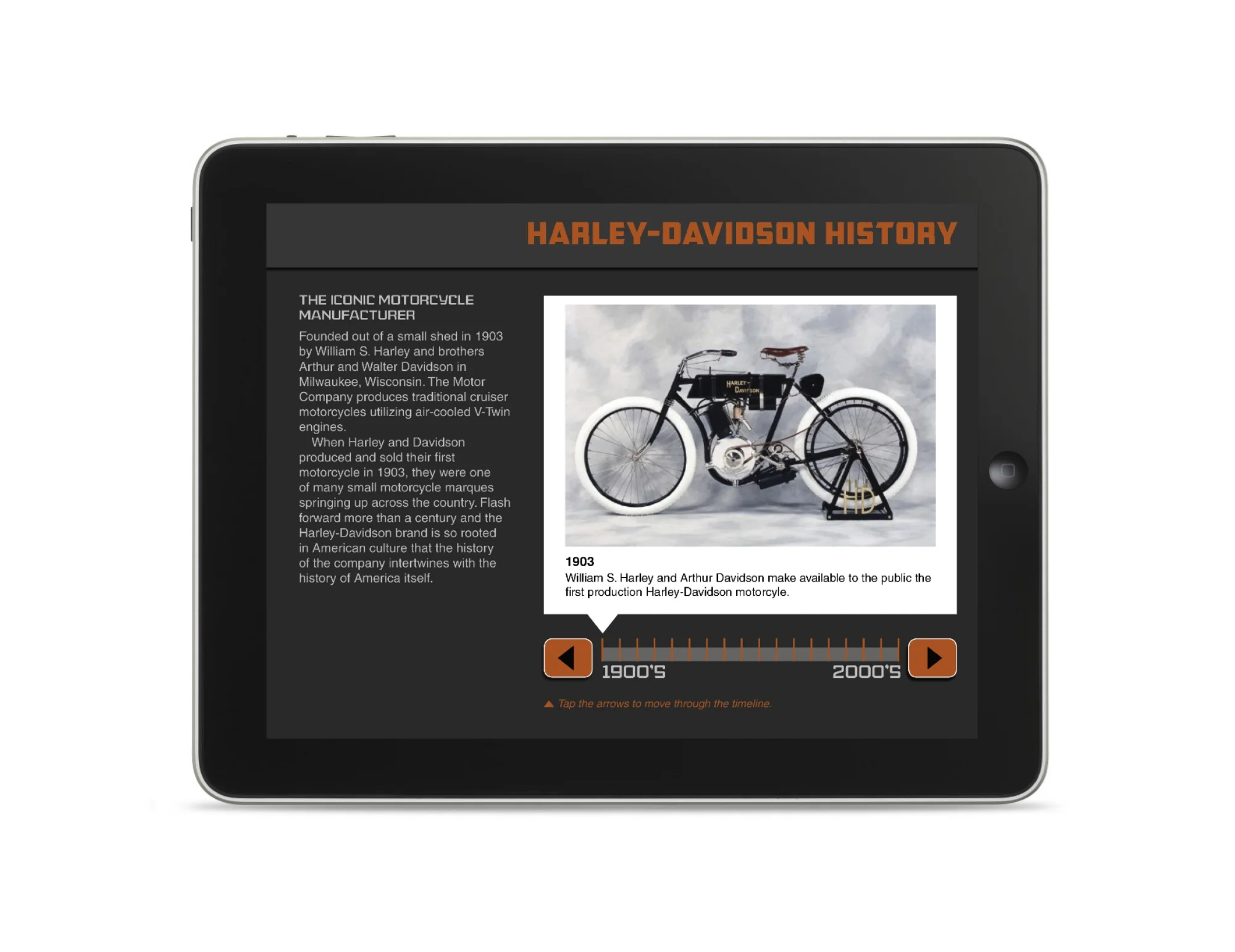 The Beginner's Guide: A Brief History & Visual Explanation is an iPad publication used to give the user a full interactive experience as they learn about one of America's most iconic brands, Harley-Davidson. The pub features interactive videos, buttons, slideshows and timelines.