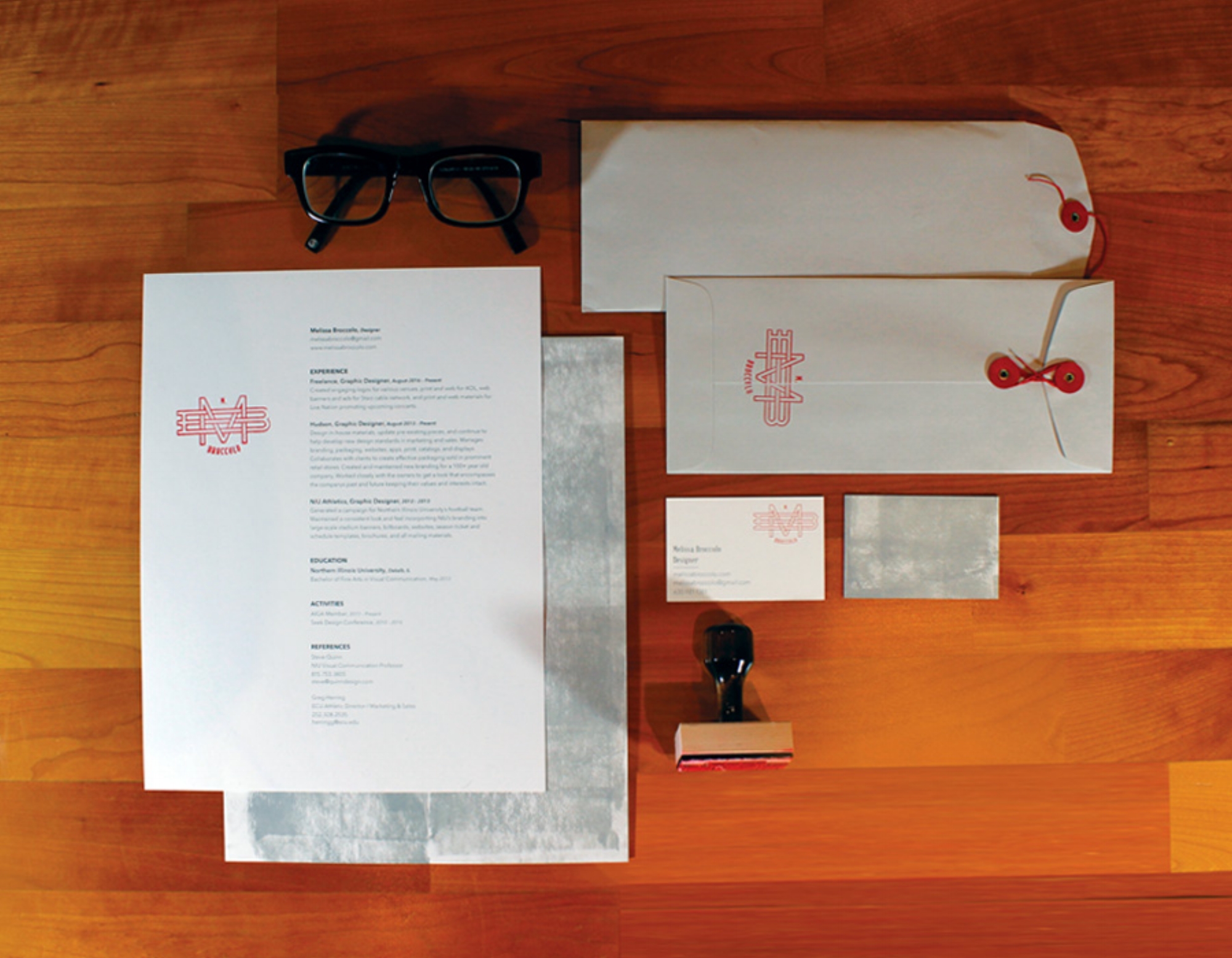 Complete personal identity system featuring a cover letter, resume, business card, and envelope. All stamped with a personal mark. A clean slick surface, with a rough textured back.